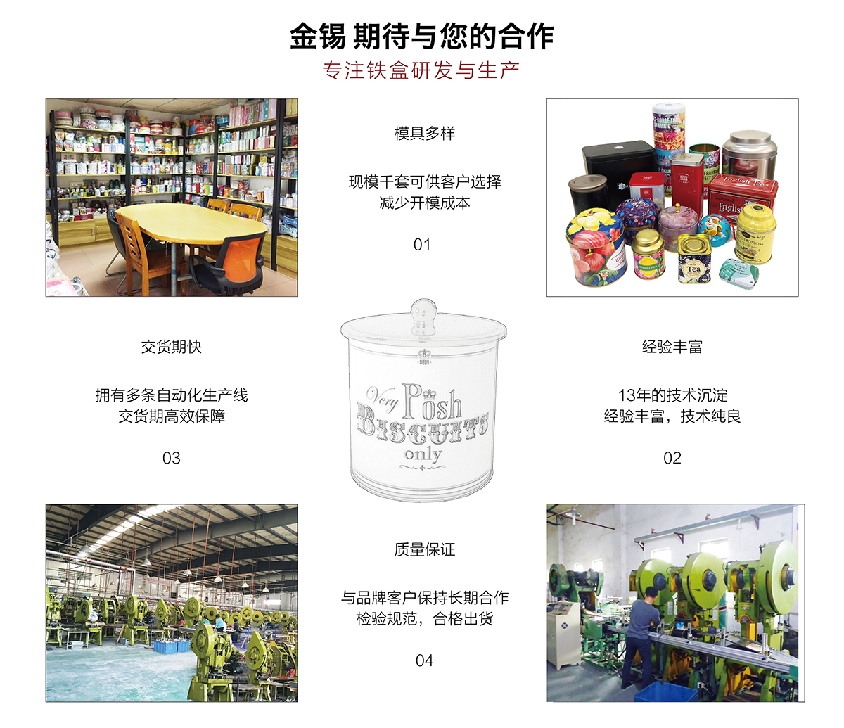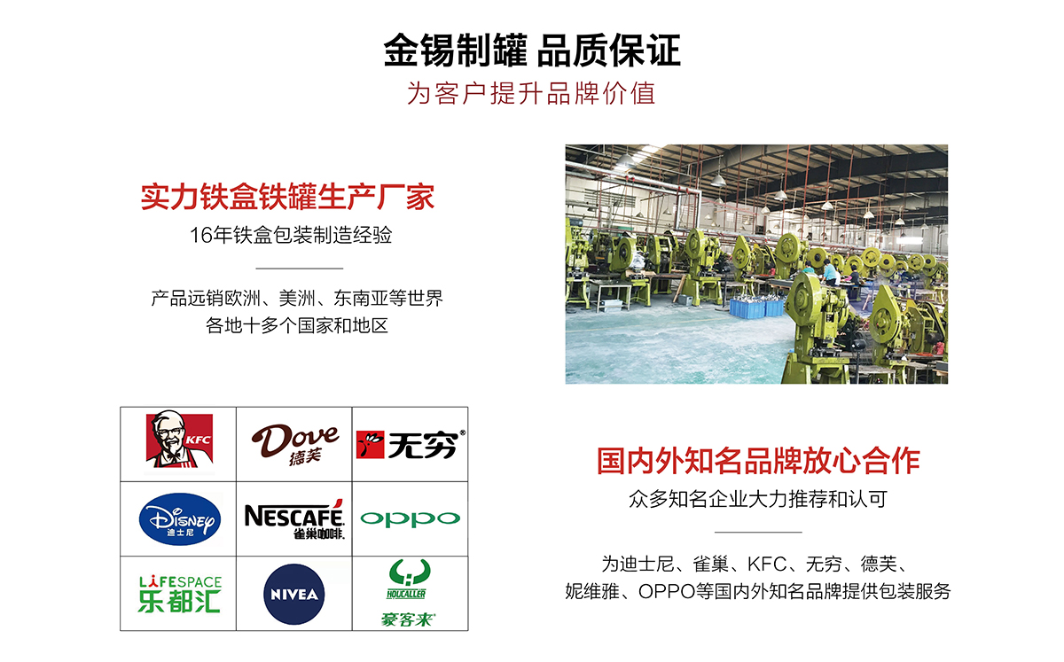 廣州市金錫五金制品有限公司成立于2016年,是已有13年生產(chǎn)經(jīng)驗(yàn)的實(shí)力廠(chǎng)家。我廠(chǎng)是專(zhuān)業(yè)定制優(yōu)良馬口鐵盒、鐵罐、禮品盒、茶葉罐、月餅盒等金屬鐵盒包裝的制罐企業(yè),我們擁有超過(guò)6000平方米的標(biāo)準(zhǔn)現(xiàn)代化廠(chǎng)房及八條生產(chǎn)線(xiàn)。公司集產(chǎn)品研發(fā)、設(shè)計(jì)、生產(chǎn)、銷(xiāo)售于一體,技術(shù)優(yōu)良,實(shí)力雄厚。通過(guò)十多年的制罐經(jīng)驗(yàn),我們擁有專(zhuān)業(yè)的技術(shù)團(tuán)隊(duì),嚴(yán)格的作業(yè)流程、完整的品質(zhì)保障體系、完善的銷(xiāo)售以及售后服務(wù)系統(tǒng)。